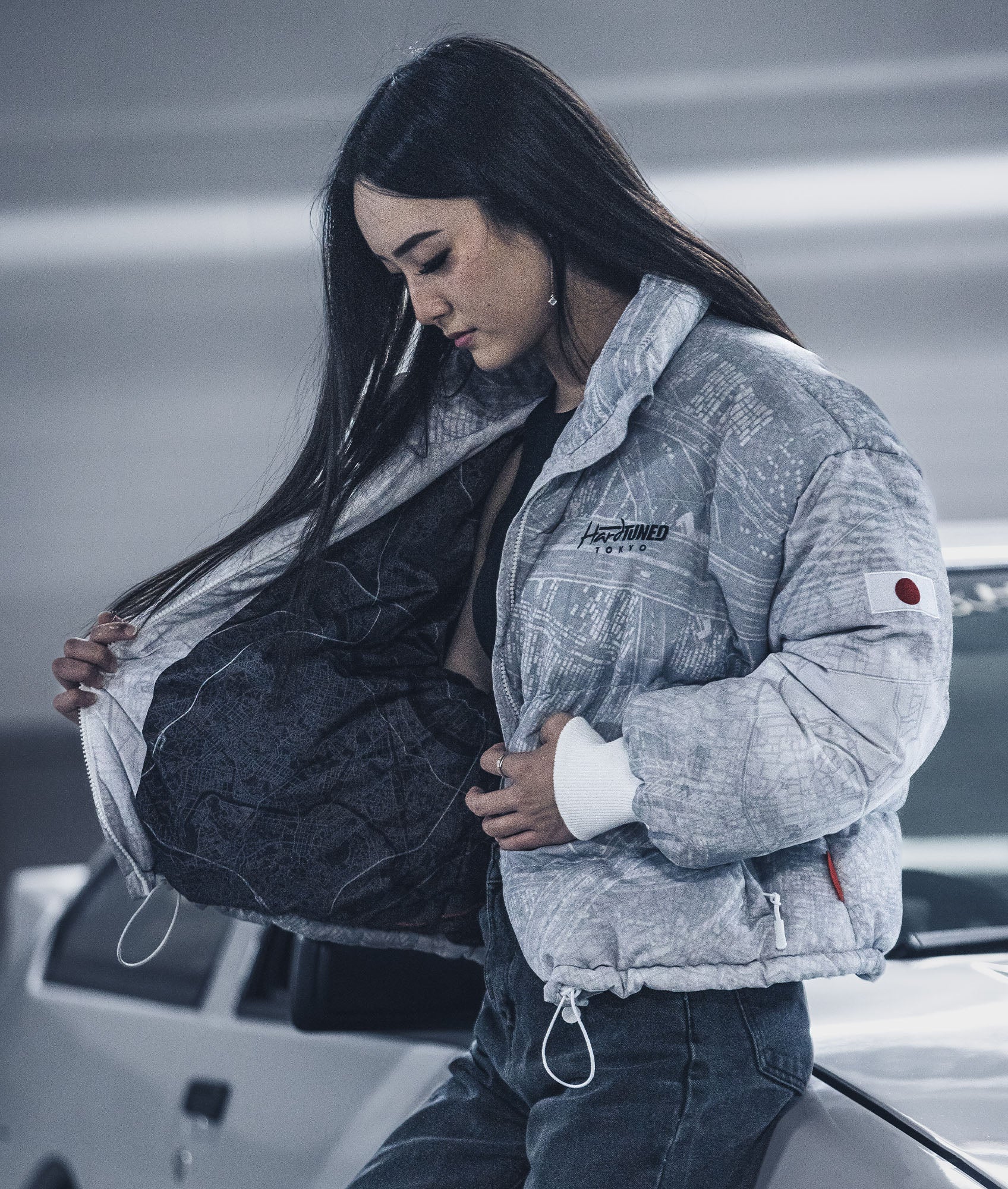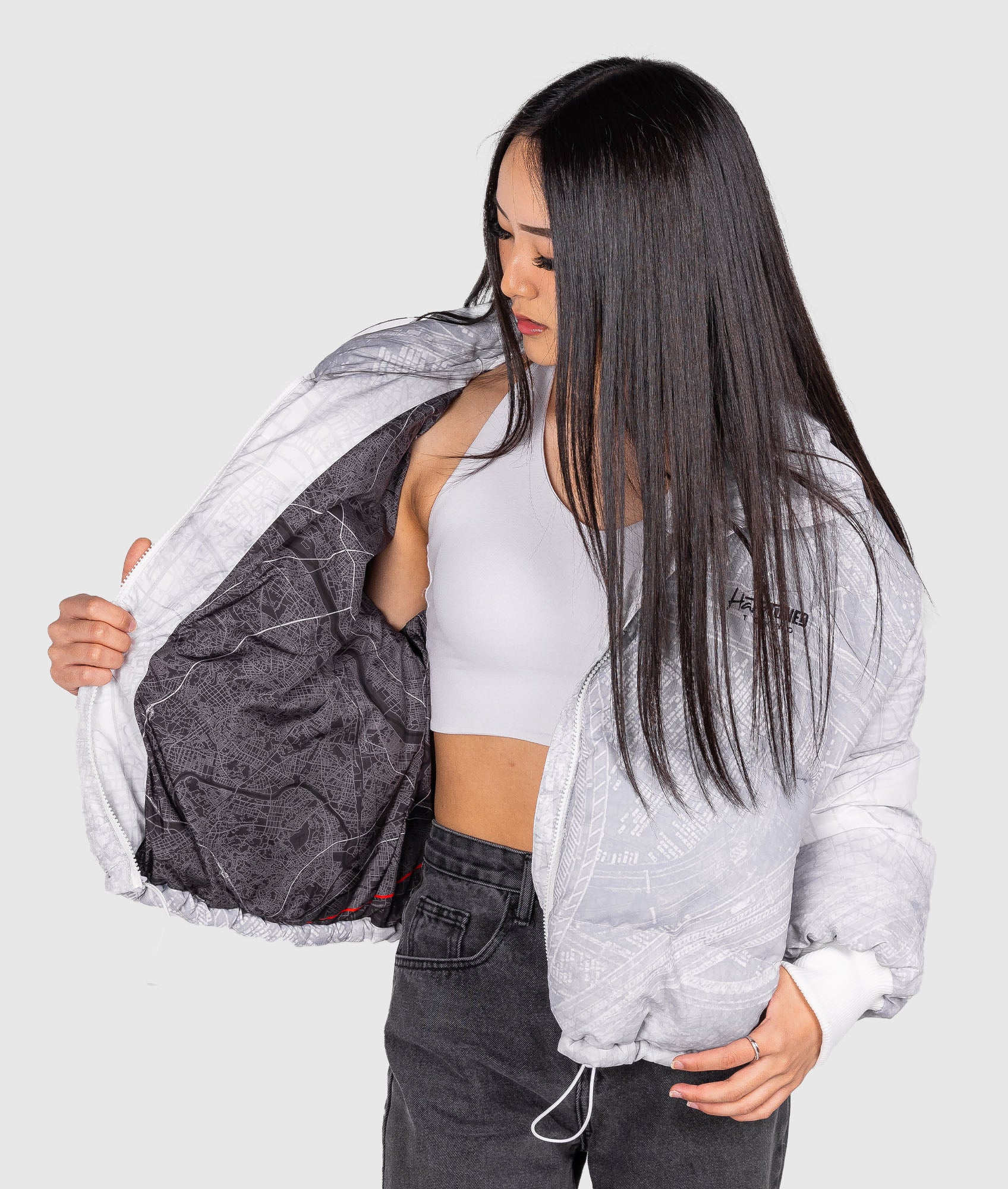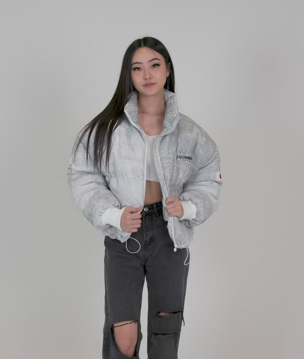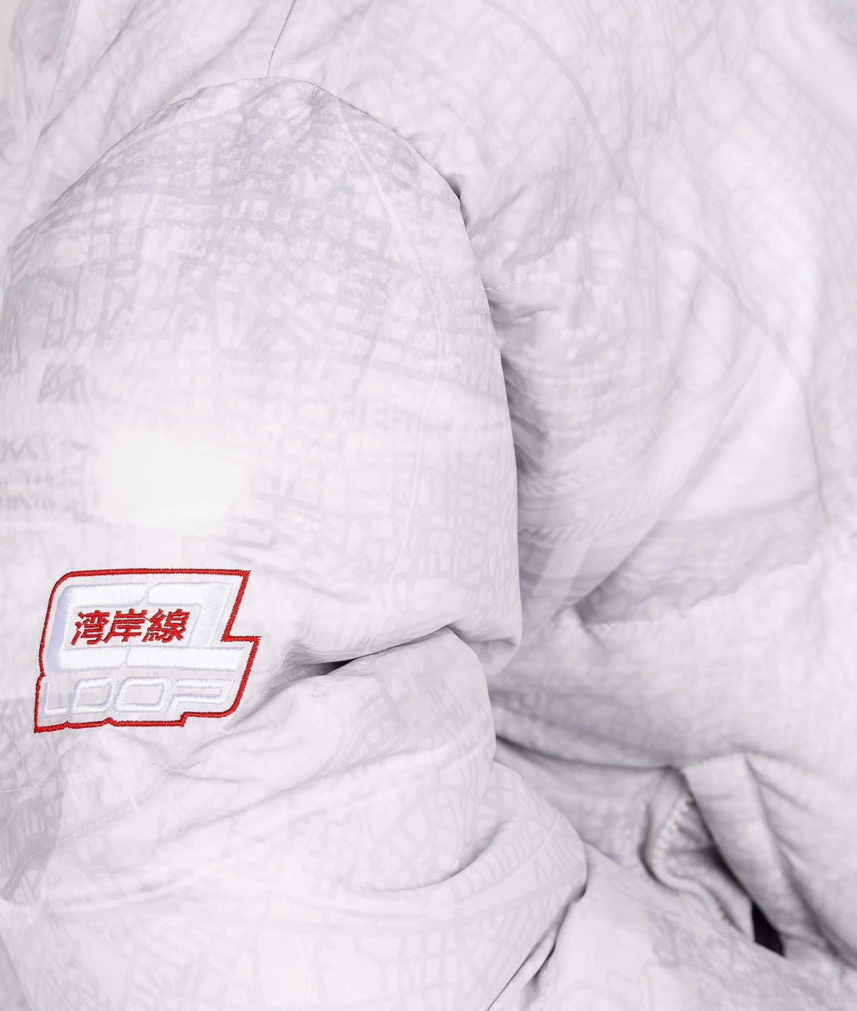 Details like you've never seen in a puffer jacket! The Shuto White Puffer Jacket features a subtle all-over geographical print of Tokyo Bay on the outside with a HUGE reverse print on the inner that highlights the iconic C1 Loop of the Shuto Expressway system in Tokyo.